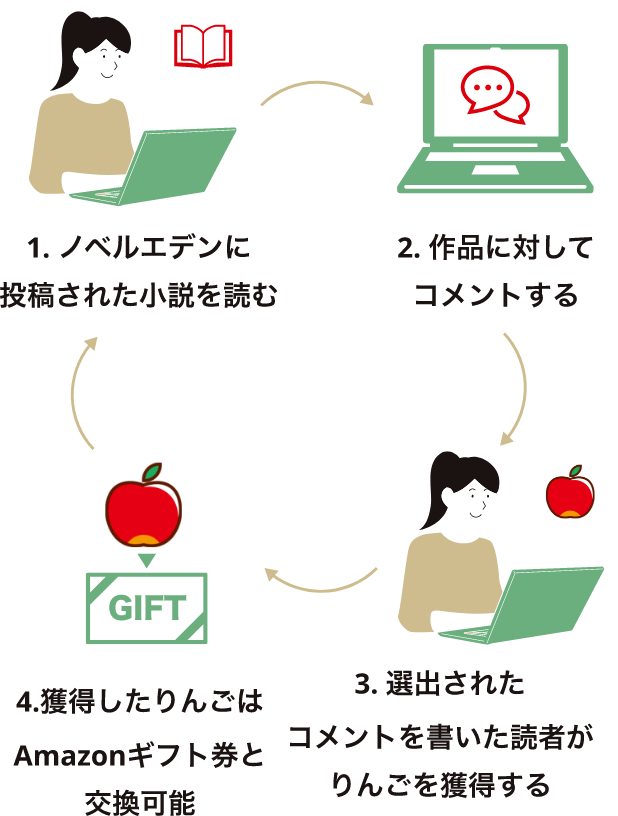 小説を読んでコメントを書き、そのコメントが作者から選出されると「りんご」が贈られ、